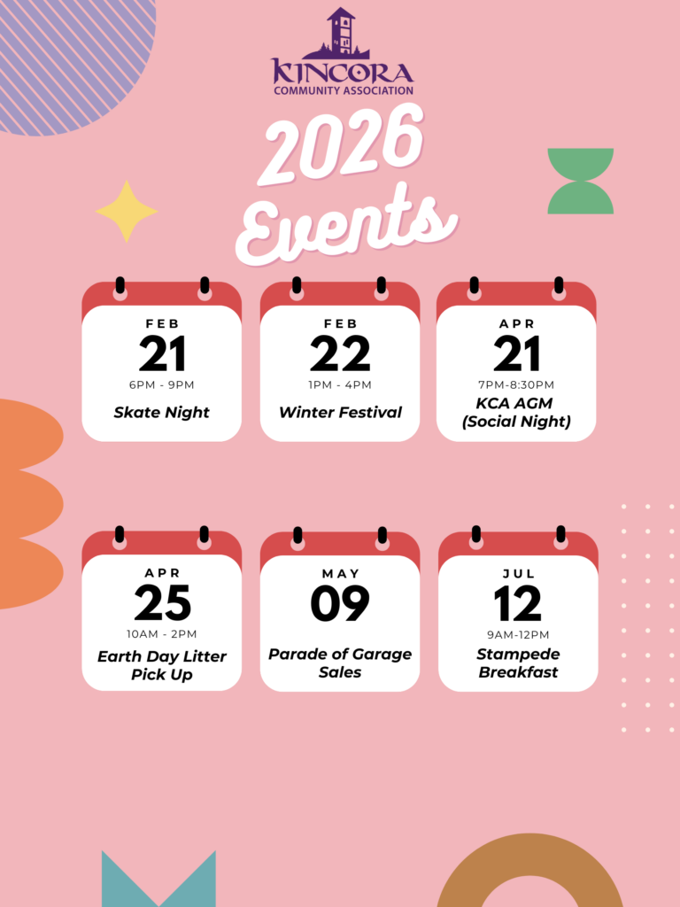 Events KCA Social Night & Annual General Meeting April 21, 2026, 7:00 pm-9:00 pm Mingle with the KCA board, and fellow Kincora residents. Enjoy light snacks, and drinks! Followed by the Kincora Community Association AGM. Symons Valley United Church – Sanctuary Room. Earth Day Litter Pick Up April 25, 2026, 10:00 am-2:00 pm Details to Come Parade of Garage Sales May 9, 2026, 10:00 am-4:00 pm Details to Come